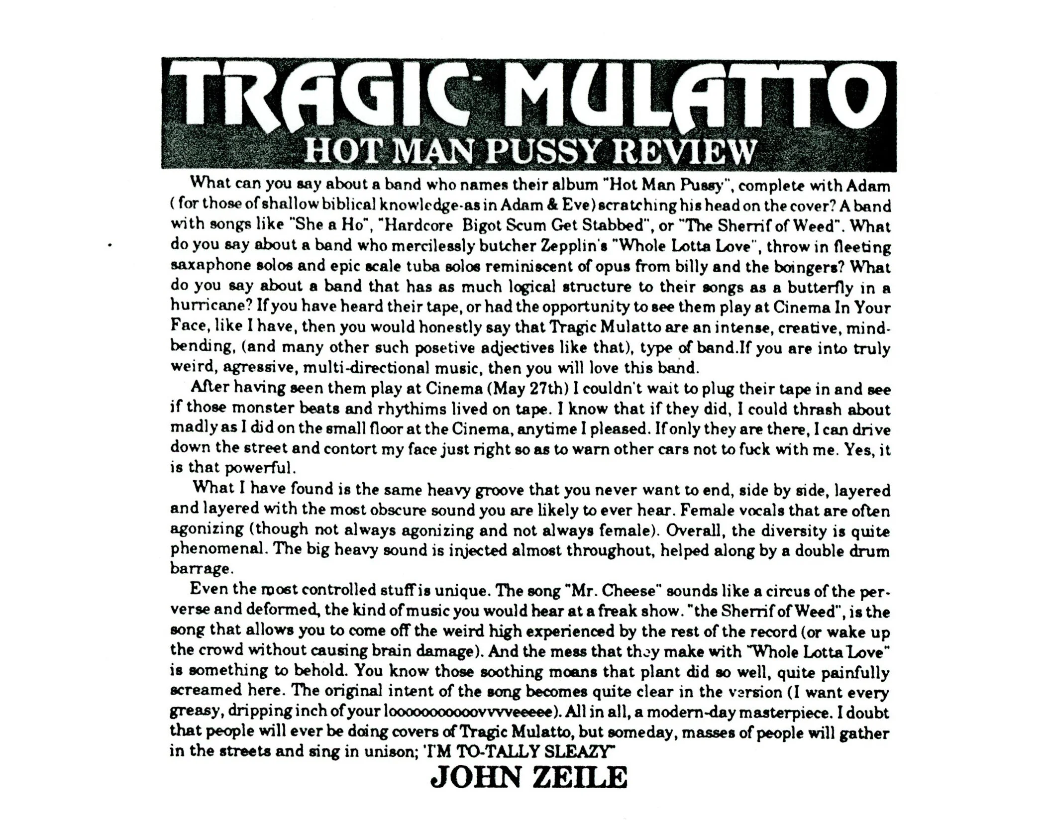 What can you say about a band who names their album "Hot Man Pussy,” complete with Adam (for those of shallow biblical knowledge-as in Adam & Eve) scratching his head on the cover? A band with songs like "She a Ho", "Hardcore Bigot Scum Get Stabbed", or "The Sherrif of Weed". What do you say about a band who mercilessly butcher Zeppelin's "Whole Lotta Love," throw in fleeting saxophone solos and epic scale tuba solos reminiscent of Opus from Billy and the Boingers? What do you say about a band that has as much logical structure to their songs as a butterfly in a hurricane? If you have heard their tape, or had the opportunity to see them play at Cinema In Your Face, like I have, then you would honestly say that Tragic Mulatto are an intense, creative, mind bending, (and many other such positive adjectives like that), type of band.If you are into truly weird, aggressive, multi-directional music, then you will love this band.
