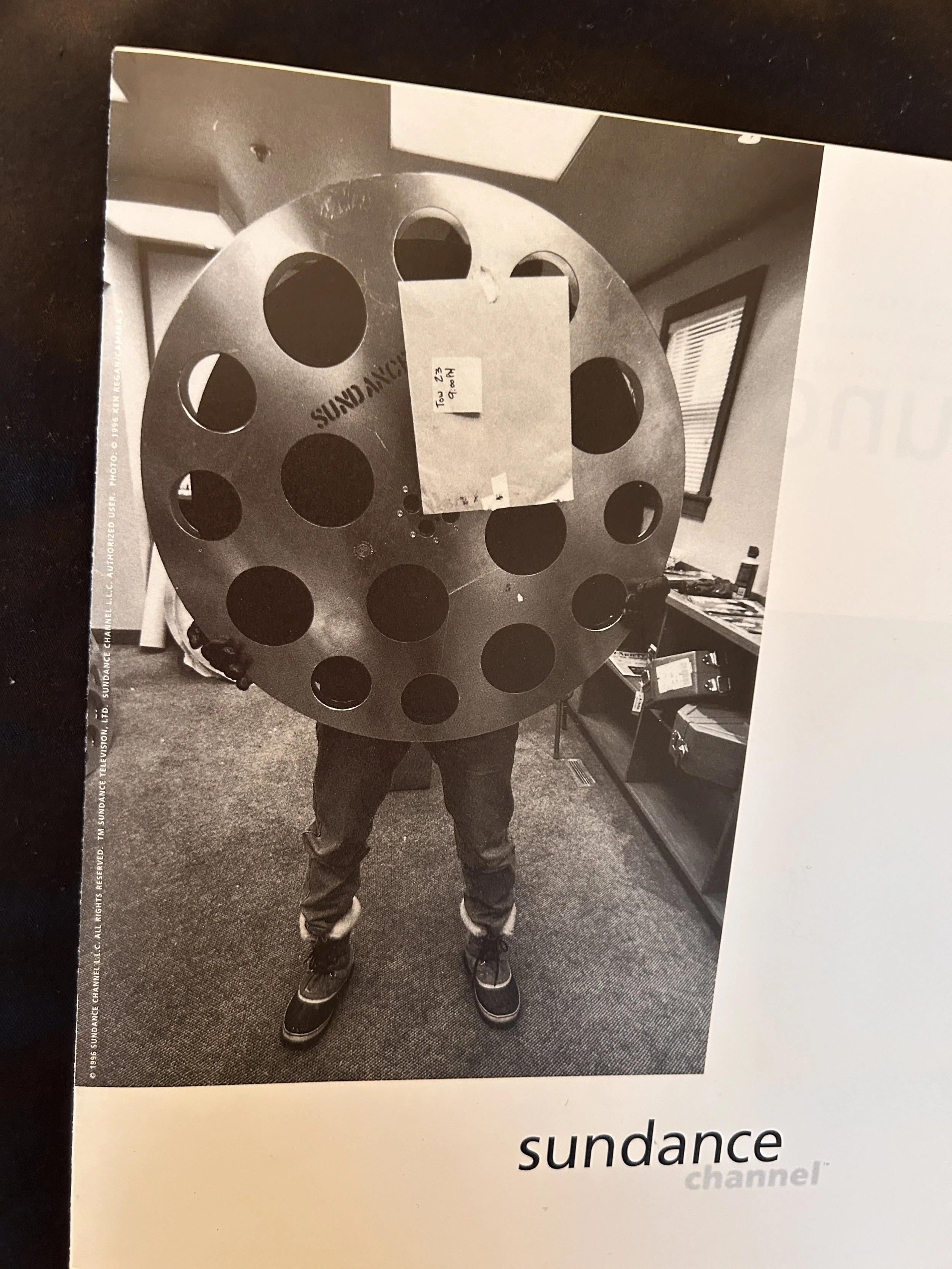 The Sundance Channel emerged near the time of my exit after a decade with the festival. I always loved the cover image they used for their initial promotional materials, featuring my teammate Jeff Winograd holding one of the giant reels of film we moved around the city and mountains each year. The handwriting on the post-it note is mine, a system so basic and effective as to be laughable! Yeah, fuck digital and AI bullshit, this was the heyday of the festival and of independent film, without a doubt!